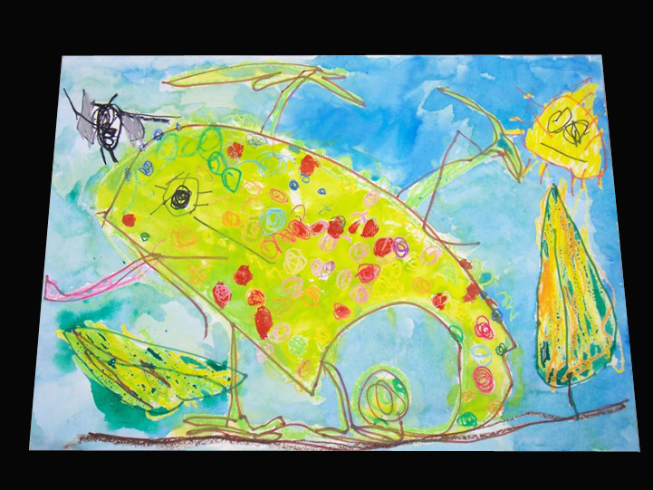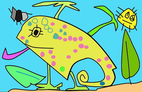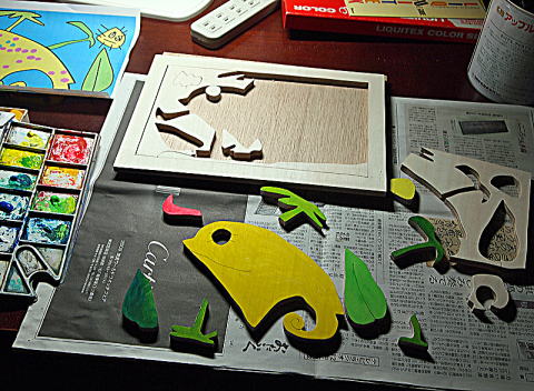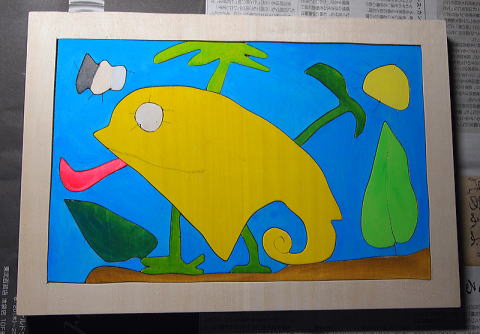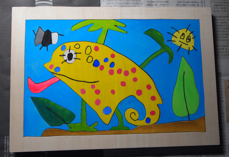 | 8.下塗りが乾いた後、カメレオンの模様を塗り細かなところは油性マジックで描き込みました。 |