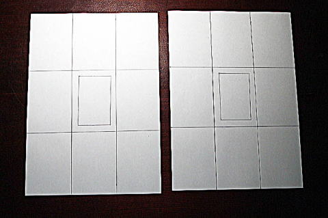 | A4の用紙を2枚用意します。 ここではコピー用紙を使っていますが、画用紙やケント紙など厚めの用紙の方がいいかと思います。 A4サイズは210mm×297mmなので幅70mm高さ99mmで3等分の線を引きます。 まん中の四角は10mm内側に描いて下さい。 |