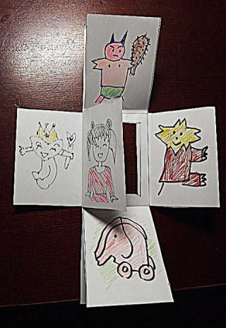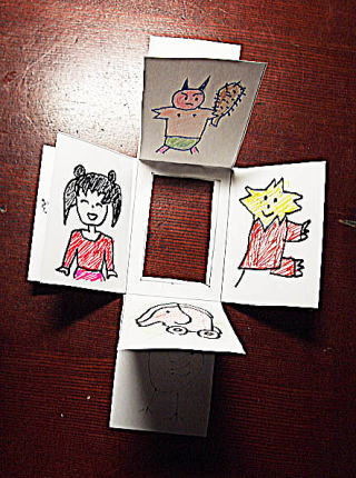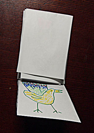 | 全部閉じて完成です。 まん中に入れたい絵を何気なく1番先に折り込んで下さい。 横の絵はちゃんと入りますが、上下の絵は逆さまに入ってしまうのが難点です。 上下の絵だけあらかじめ逆さまに描いておけば、広げた時に逆になりません。 たった2枚の紙で充分楽しめるパズルだと思います。 まん中に薄いアクリル板などを使えば重厚さが出ると思います。 それぞれアレンジを楽しんで下さい。 どんなパズルができたか感想を送っていただけるとうれしいです。 送っていただいた方にはお好きな木の動物のパズルをプレゼント致します。 e-mail pallet@wind.ne.jp 動物パズルは http://woodpuzzle.shop-pro.jp/ のサイトをご覧ください。 |